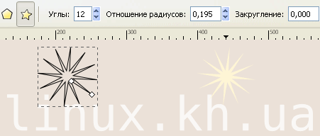 1. Сначала нарисуем хохолок одуванчика. Инструментом "Рисовать звезды и многоугольники" (Shift+F9) рисуем звездочку. Задаем ей 10-12 углов. Оконтуриваем звездочку - Ctrl+Shift+C.