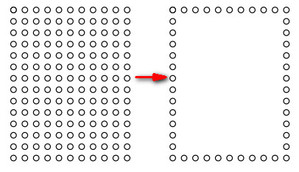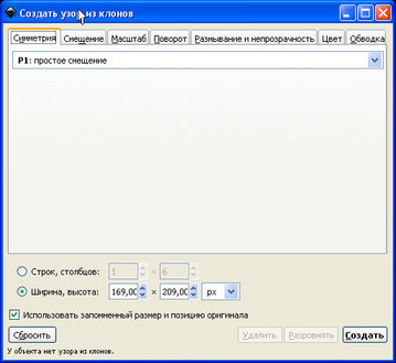 5. Выделите круг и с помощью операции клон Правка→Клоны→Создать узор из клонов создайте прямоугольник, заполненный копиями маленького круга. Расстояние между зубцами приблизительно равно диаметру самого круга, поэтому во вкладке Смещение выставьте в обоих случаях 100% (1), т.е. полный размер круга, а область заполнения вычислите как Ширина = Ширина прямоугольника + Диаметр круга, Высота = Высота прямоугольника + Диаметр круга.