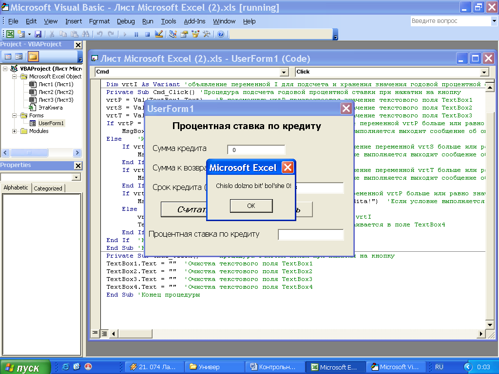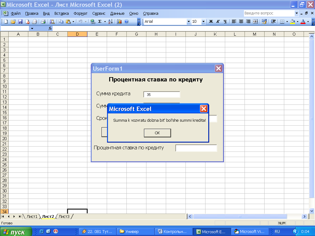 MsgBox ("Summa k vozvratu dolzna bit' bol'she summi kredita!") 'Если условие выполняется выходит сообщение об ошибке