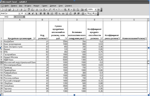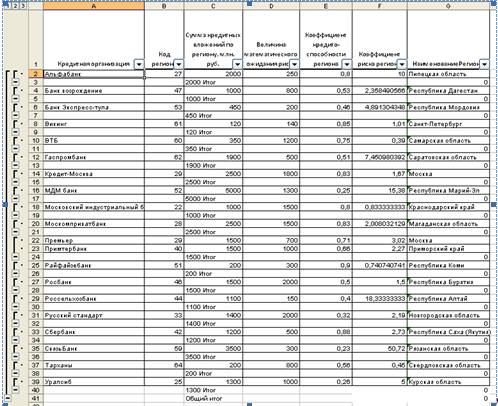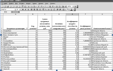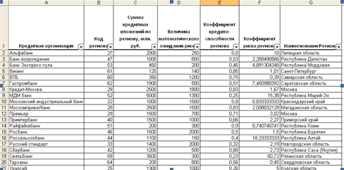 Введем формулу в ячейку F1 коэффициент риска региона = Сумма кредитных вложений по региону / (Величина математического ожидания риска*Коэффициент кредитоспособности региона);