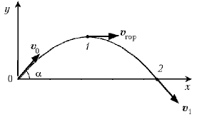 Пренебрегая размерами снаряда, будем считать его материальной точкой. Введем систему координат xOy, совместив ее начало O с исходной точкой, из которой пущен снаряд, ось x направим горизонтально, а ось y — вертикально (рис. 1).
