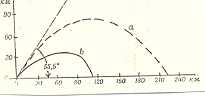 Максимальная дальность полета при данной скорости вылета достигается при угле бросания 45°. Когда угол бросания составляет 30 или 60°, то дальность полета тел для обоих углов оказывается одинаковой. Для углов бросания 75 и 15° дальность полета будет опять одна и та же, но меньше, чем при углах бросания 30 и 60°. Значит, наиболее "выгодным" для дальнего броска углом является угол в 45°, при любых других значениях угла бросания дальность полета будет меньше.