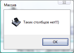 При нажатии а кнопку "ОК" появится Диалоговое окно формы (рис. 3.3), значения (1,1) обведенные красным это значения в которые можно ввести все те числа какие вам захочется. Сейчас я вам покажу как все это должно выглядеть. Для начала мы введем числа (рис.3.4). Потом при нажатии на кнопку "Нарисовать массив" Выскочит следующее окно пояснение изображенное на (рис. 3.5). После нажатия на кнопку "ОК" у нас появится таблица с заданной нами розмерностью . Ниже приведены рисунки "Диалоговых окон" при помощи которых идет пояснение каждого хода программы (краткий инструктаж по программе). На (рис.3.8) изображено окно (предупреждение), которое отвечает за то что когда вы введете число больше чисел заданных в массиве то вам будет выведено окно предупреждение, и вы будете вынуждены ввести заново числа только те числа которые входят в пределы массива заданного вами. На (рис.3.9) изображено окно предупреждение которое отвечает за то, что при введении одинаковых чисел в пределе массива, то оно вас предупредит что бы вы этого не делали. К (рис.3.10) и (рис.3.11) идут аналогичные пояснения как и к (рис.3.8) и (рис.3.9) но только для столбцов.