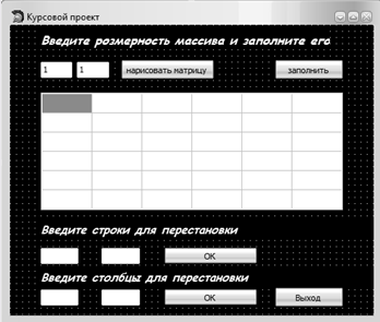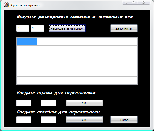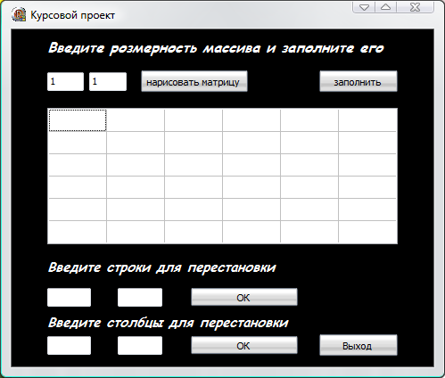 Данная программа имеет множество кнопок, при помощи которых можно выполнить определенны операции. Такие как создание массива и саму перестановку строк и столбцов.