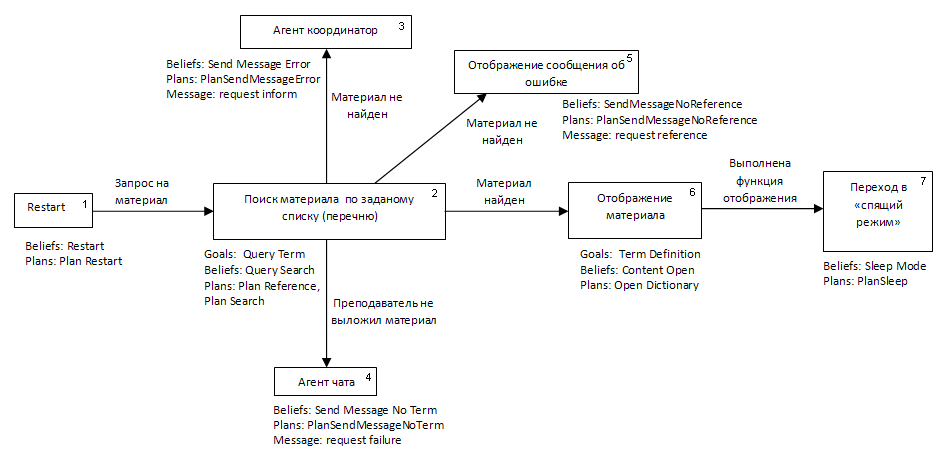 Итак, с помощью модели определим работу агента. Запуск агента происходит (1 блок модели), когда подается запрос через гиперссылку на поиск дополнительной информации о термине в том материале (лекции, лабораторные, практические и т.д.), который проходит студент, это отображено на 2 блоке модели. Эту операцию агенту глоссарию поручает агент координатор, который управляет взаимодействием между всеми личными агентами. Когда запрос подан, агент начнет производить поиск термина в xml файле, который содержит описание всех терминов. Если заданный термин не найден, то агент посылает сообщение, что данного материала нет (3 блок). Только когда не найдена ссылка, сообщение отправляется агенту координатору. Но когда материала вообще нет в наличии, то сообщение отправляется агенту чата (4 блок модели), чтобы было отправлено письмо преподавателю о том, что необходимо выложить данный материал.