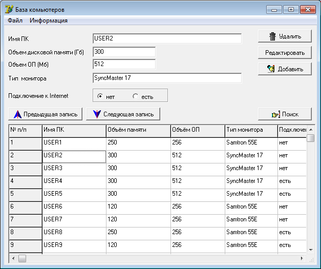 Согласно заданию необходимо разработать программу для системного администратора, в которой хранится вся комплектация компьютеров его предприятия, предусмотреть ввод, удаление и правку информации. При этом для каждого компьютера необходимо хранить следующую информацию: наименование, ёмкость жёсткого диска, ёмкость оперативной памяти, тип монитора, наличие подключения к интернет. Обработка должна включать: создание и чтение файла; дополнение, удаление, корректировка, поиск данных файла.