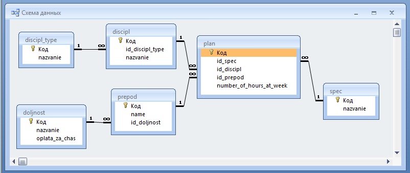 FROM spec INNER JOIN ((discipl_type INNER JOIN discipl ON [discipl_type].[Код]=[discipl].[id_discipl_type]) INNER JOIN plan ON [discipl].[Код]=[plan].[id_discipl]) ON [spec].[Код]=[plan].[id_spec]