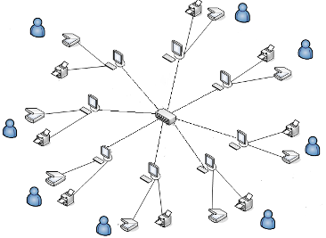 При топологии "звезда" все компьютеры с помощью сегментов кабеля подключаются к центральному компоненту, именуемому концентратором (hub). Сигналы от передающего компьютера поступают через концентратор ко всем остальным. Эта топология возникла на заре вычислительной техники, когда компьютеры были подключены к центральному, главному, компьютеру.