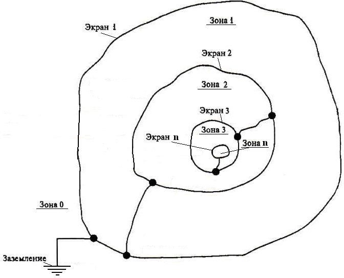 На границах зон осуществляется экранирование и соединение всех пересекающих границу зон металлических элементов и коммуникаций между собой.