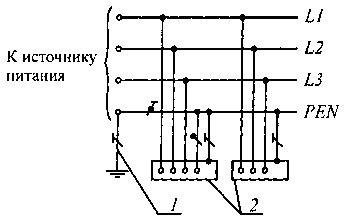Классификация помещений по опасности поражения людей электрическим током (правила устройства электроустановок ПУЭ). Все производственные помещения в зависимости от наличия условий, создающих опасность поражения людей электрическим током, подразделяются на классы: помещения без повышенной опасности (помещения, в которых отсутствуют условия, создающие повышенную или особую опасность); помещения с повышенной опасностью (помещения, в которых имеется одно из следующих условий, создающих повышенную опасность: относительная влажность воздуха длительно более 75%; токопроводящая пыль; токопроводящий пол; температура воздуха длительно превышает +35оС; возможность одновременного прикосновения человека к имеющим соединение с землёй металлоконструкциям зданий, технологическим аппаратам, механизмам и т. п., с одной стороны, и к металлическим корпусам электрооборудования – с другой стороны); особо опасные помещения (помещения, в которых имеется одно из следующих условий, создающих особую опасность: относительная влажность воздуха близка к 100 %; химически активная или органическая среда, разрушающая изоляцию и токоведущие части электрооборудования; наличие одновременно двух и более условий повышенной опасности).