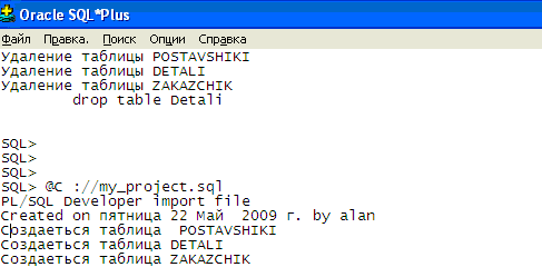 Після цього, за умови правильно введеного паролю та шляху зв’язку до бази даних, з’являється основне вікно утиліти SQLPLUSW.exe, в якому користувач може вводити SQL-запити, які, при наявності відповідних прав у користувача, можуть бути оброблені. Основне вікно програми наведено нижче.