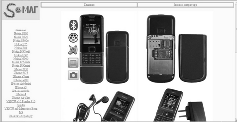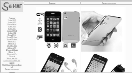 Контент представляет собой каталог товаров, в котором приведены фотографии и описание различных средств связи (мобильных телефонов). Браузер открыв окно предлагает пользователю "Главную" страницу, где имеется перечень товаров и доступ к дополнительным опциям, все эти же возможности продублированы в блоке "Меню", который расположен в левой части страницы. Перейдя по ссылке товара можно ознакомится с его характеристиками, и далее воспользовавшись встроенными кнопками ссылками либо вернуться на "Главную" страницу, либо получить данные для связи с оператором. Связаться с оператором возможно так же через специальный пункт "Меню". Сайт создан с помощью языка разметки гипертекста HTML. При производстве использована технология фреймов. В качестве графической составляющей использованы рисунки в формате .jpg, т.к. данный формат сохраняет рисунок с минимальным объёмом (размером), размером 15—100КБ, и безопасная цветовая палитра. Объём сайта составляет—6,7МБ в обычном виде и 5,32—ввиде архива Win.rar.