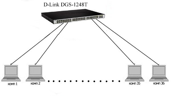 Для побудови даної комп’ютерної мережі я вирішив використати комутатор фірми D-Link DGS-1248T/GE (WebSmart комутатор з 44 портами 10/100/1000Base-T + 4 комбо-портами 1000Base-T/Mini GBIC (SFP) і функцією енергозбереження). Комутатор DGS-1248T/GE є ефективним способом підвищення продуктивності та безпеки мереж малого бізнесу. DGS-1248T забезпечує швидкість Gigabit Ethernet для підтримки програм, чутливих до смуги пропускання, і розширення ємності мережі. Розширений функціонал включає комбо-порти Gigabit, підтримку Power over Ethernet1, QoS, а також функції гнучкого багатофункціонального управління. Підтримка Power over Ethernet дозволяє спростити установку бездротових точок доступу, мережевих камер, телефонів VoIP та іншого мережного обладнання.
