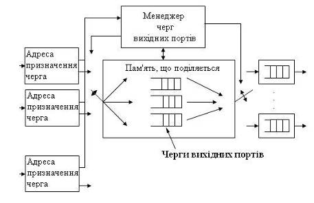 Вхідні блоки процесорів портів з'єднуються з входом перемикачем, що, поділяє пам'ять, а вихідні блоки цих же процесорів з'єднуються перемикачем з виходом цієї пам'яті. Перемиканням входу й виходу поділюваної пам'яті управляє менеджер черг вихідних портів. У поділюваній пам'яті менеджер організує кілька черг даних, по одній для кожного вихідного порту. Вхідні блоки процесорів передають менеджерові портів запити на запис даних у чергу того порту, що відповідає адресі призначення пакета. Менеджер по черзі підключає вхід пам'яті до одному із вхідних блоків процесорів і той переписує частину даних кадру в чергу певного вихідного порту. По мірі заповнення черг менеджер робить також почергове підключення виходу поділюваної пам'яті до вихідних блоків процесорів портів, і дані із черги листуються у вихідний буфер процесора.