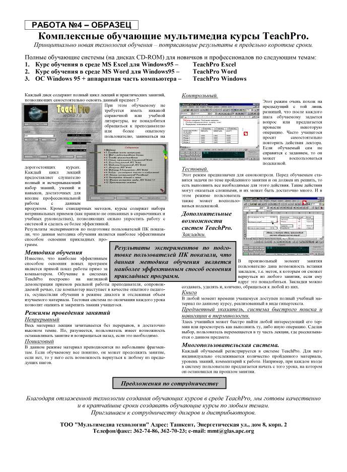 Данная работа поможет вам приобрести элементарные навыки, связанные со вводом и редактированием текста. Вы получите первое представление о командах форматирования различных объектов документа. В процессе работы вы подготовите небольшой одностраничный документ, состоящий из нескольких абзацев текста, рисунка и таблицы.