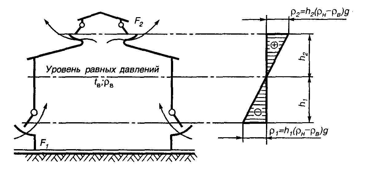 Рис. 4.1. Схема естественной вентиляции здания: а — при безветрии; б — при ветре; 1 — вытяжные и приточные отверстия; 2 — тепловыделяющий агрегат