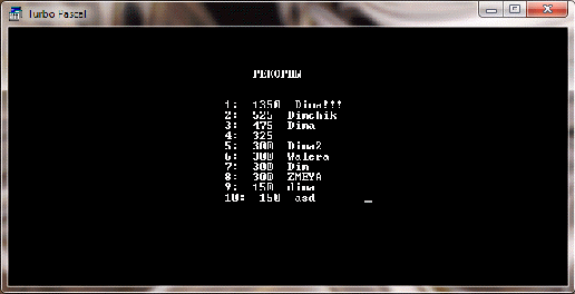 2. Выбрав меню "Рекорды", на экране должна появиться таблица результатов такого формата: <занимаемое место>: <набранный результат> <имя игрока>