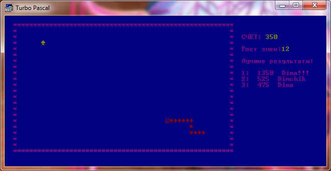 3. Змейка должна собирать пищу (символы на экране, которые появляются случайно); при этом змейка должна "разбиваться" при столкновении с границей игрового поля и со своим "хвостом".