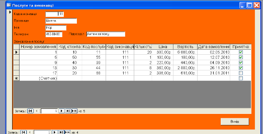 3 Форму Виконавці послуг для вводу та модифікації даних з таблиці Виконавці послуг;