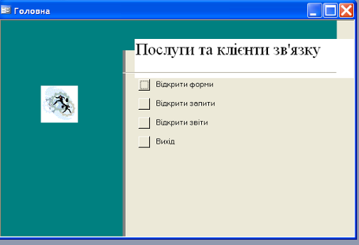 Для того, щоб створити головну кнопочну форму перейдемо на вкладку “Формы”. Виконаємо команду: меню Сервис/Надстройки/Диспетчер кнопочных форм. На запитання, чи створити кнопочну форму, натискуємо так. Відкривається діалогове вікно “Диспетчер кнопочных форм”, в якому натискуємо “Изменить”. Введемо назву кнопочної форми “Послуги на ремонтні роботи” у вікні “Изменение кнопочной формы”. Натискаємо кнопку “Создать”. Додамо перший елемент. В полі “Текст” введемо “Види послуг”. В списку “Команда” виберемо “Открытие формы в режиме редактирования”. В списку “Форма” виберемо “Види послуг”. Натискаємо “ok”. Аналогічно додамо всі інші форми. Натискаємо “Закрыть” для повернення до кнопочної форми. Тепер створимо нову сторінку кнопочної форми для роботи з звітами. У вікні “Диспетчера кнопочных форм” натискаємо “Создать”. Вводимо ім’я “Звіти”. Натискаємо “ok”. Виділяємо ім’я “Звіти”, кнопку “Изменить”. В новому вікні кнопка “Создать”. В списку “Команда” вибираємо “ Открытие отчета”. В списку “Отчет” вибиремо “Аналіз замовлень в розрізі місяців”. Створимо кнопку переходу між сторінками. Кнопка “Создать”, в списку “Команда” виберемо “Переход к кнопочной форме”, в списку “Кнопочная форма" виберемо “Послуги на ремонтні роботи”, в полі “Текст” введемо “Послуги на ремонтні роботи”. Натискаємо “ok”, “Закрыть”. Те ж саме створимо для кнопочної форми. На вкладці “Формы” з’явилось ім’я “Кнопочная форма”. Відкриємо кнопочну форму в режимі “Конструктор”. Зліва вставимо логотип фірми. Маємо:
