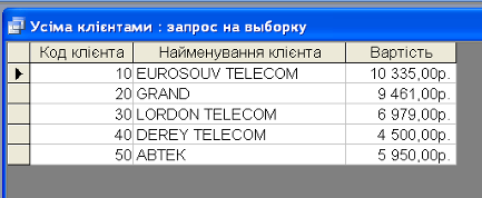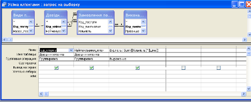 Створимо груповий запит, який визначає для всіх видів послуг загальну вартість замовлень усіма клієнтами. На вкладці “Запросы” натискаємо кнопку “Создать” і вибираємо конструктор. Додаємо таблицю “Довідник клієнтів” і переносимо її поля “Код клієнта" та “Найменування клієнта”. В будівнику створюємо поле “Вартість" (так само, як і в попередніх запитах). Виконуємо меню “Вид/Групповые операции”. З’являється ще одна комірка “Групповая операция”. В полі “Вартість" зі списку групових операцій обираємо “Sum”. Зберігаємо запит під назвою “Усіма клієнтами" і натискаємо на кнопку “Режим таблицы”.