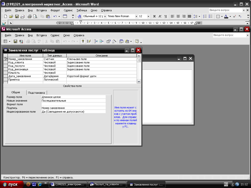 Тепер перейдемо до створення таблиці “Види послуг”. На вкладці “Таблиці” знову ж таки натискуємо Кнопку “Создать”. В конструкторі в поле “Имя поля” вводимо “Код послуги”, тип даних вибираємо “Числовой”, індексоване поле - “Да (Совпадения не допускаются”. Це поле робимо ключовим, оскільки через нього дана таблиця буде зв’язана з таблицею “Замовлення послуг”. В наступне ім’я поля вводимо “Назва послуги”, тип даних - “Текстовый”, який задається по умовчанню, дає можливість вводити текст або числа, які не потребують розрахунків, наприклад, номер телефону, і задаємо розмір поля 60. Наступне ім’я поля - “Ціна, грн.". Тут тип поля задаємо “Денежный”, який дає можливість вводити грошові значення і числові дані, які використовуються в числових розрахунках, приведені з точністю до 15 знаків в цілій і до 4 знаків в дробовій частині. Зберігаємо таблицю під назвою “Види послуг”.