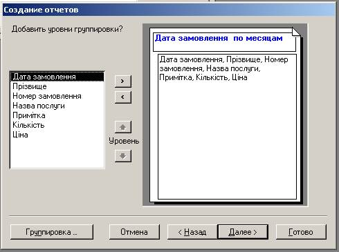 Натискаємо кнопку “Далее” і вибираємо тип представлення даних “по Замовлення послуг”. Натискаємо “Далее”. Додаємо рівень групування, виділивши “Дата замовлення” і натиснувши “>”. Маємо: