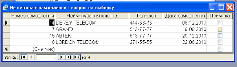 Прейдемо до створення запиту про не виконані замовлення на послуги, що замовлені до 25.12.2010. Поле “Номер замовлення” беремо з таблиці “Замовлення послуг”, поля “Назва клієнта" і “Телефон” з таблиці “Довідник клієнтів”, поля “Дата замовлення” та “Примітка" з “Замовлення послуг”. Оскільки нас цікавлять замовлення до 25.12.2010, то ставимо умову <#25.12.2010# в полі “Дата замовлення”. Але замовлення повинні бути не виконані, тому в полі “Примітка" накладаємо умову Нет. Зберігаємо запит під назвою “Не виконані замовлення”.