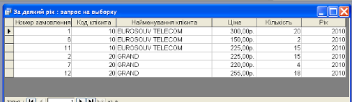 Для того, щоб створити запит про замовлення на послуги для клієнтів “Grand” і "Eurosouv Telecom" за 2010 рік додамо в запит таблиці “Замовлення послуг”, “Довідник клієнтів”, “Види послуг”, “виконавці послуг”. Перше поле “Номер замовлення” беремо з таблиці “Замовлення послуг”, наступне поле “Найменування клієнта" з таблиці “довідник клієнтів”, поля “Назва послуги" “Ціна” та з “Види послуг”, “Прізвище" з “Виконавці послуг”. Поле “Вартість" створюємо через “Построитель”, помноживши кількість на ціну. Останні два поля “Дата замовлення” та “Примітка" з таблиці “Замовлення послуг”. Оскільки нас цікавлять лише послуги для клієнтів "Grand" та "Eurosouv Telecom”, то в полі “Найменування клієнта" вводимо умову: “GRAND” or “EUROSOUV TELECOM”. Оскільки нас цікавлять лише замовлення за 2010 рік, то в полі “Дата замовлення” вводимо умову: Between #01.01.2010# And #01.01.2011#. Для того, щоб дані впорядкувати по зростанню вартості послуг, в полі “Вартість" вводимо сортування по зростанню. Отримали запит: