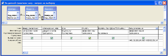 Для створення запиту “За деякий проміжок часу” у вікно запиту додаємо таблиці “Замовлення послуг”, “Види послуг”, “Довідник клієнтів”. Поля “Номер замовлення”, “Код клієнта”, “Дата замовлення”, “Кількість” беремо з таблиці “Замовлення послуг”. Поле “Найменування клієнта" з таблиці “Довідник клієнтів”, а поле “Ціна" з “Види послуг”. Поле “Вартість" створюємо так само, як і в попередніх запитах. Оскільки нас цікавить вартість замовлень за деякий проміжок часу, то в полі “Дата замовлення” задаємо умову: >#01.01.2011#And#15.02.2011#<. Оскільки нас цікавить загальна вартість, то в полі “Вартість" зі списку групових операцій вибираємо “Sum”. Але це нічого не змінює, бо в один день робилося одне замовлення. Маємо запит: