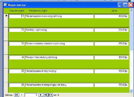 1 Форму Види послуг для вводу та модифікації даних з таблиці Види послуг;