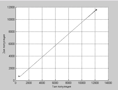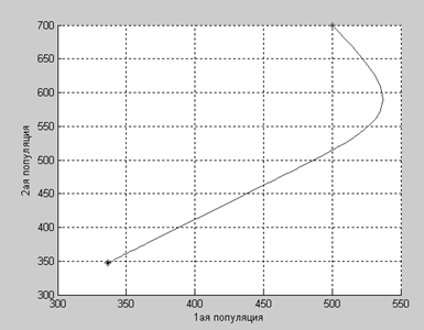 Глядя на график, можно сказать следующее. На промежутке времени (0 0,45) численности изменяются независимо друг от друга. Далее во время (0,45 1,27) первая популяция подавляет развитие второй, а во время (1,27 2,06) негативное влияние первой популяции на вторую сказывается еще сильнее. После этого, во время (2,06 3,16) вторая популяция начала конкурировать с первой, что привело к увеличению численности второй популяции и уменьшению численности первой. А ко времени (3,16 4,27) вторая популяция стала уже более серьезным конкурентом для первой. Начиная с момента времени, равного 4,27, первая популяция начинает питаться второй, что сдерживает рост второй популяции и падение численности первой.