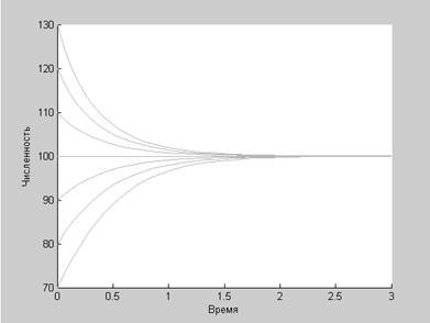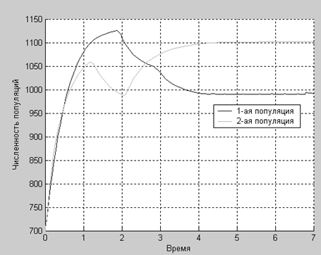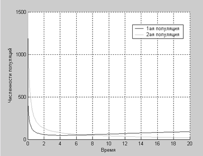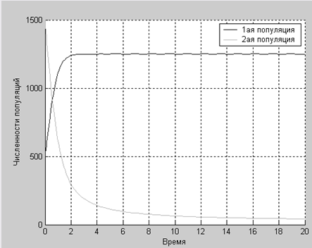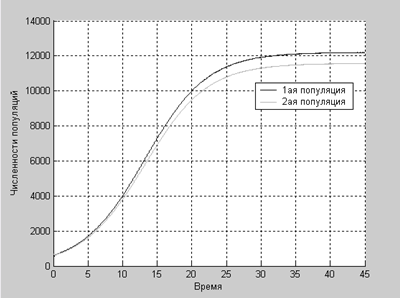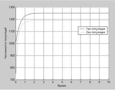 А в этом случае численности популяций растут до определенного равновесного значения.