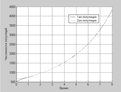 Численности популяций неограниченно растут, причем можно заметить, что с увеличением времени численности популяций практически совпадают.