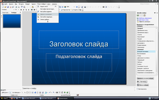 Для создания анимации необходимо применить последующие команды «Формат» - «Дизайн слайда» - «Эффекты анимации».