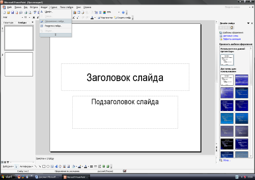 В начале создания презентации необходимо выбрать фон слайдов, для этого необходимо применить последующие команды – «Формат»- «Оформление слайда». Также можно выбрать контрастность фона: «Формат» - «Фон».
