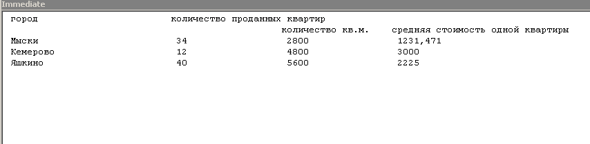 Debug. Print «город»; Tab(30); «количество проданных квартир»; Tab(50); «количество кв. м.»; Tab(70); «средняя стоимость одной квартиры»