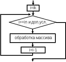 Для ввода n элементов одномерного массива, назовем его А, требуется организовать цикл, для ввода каждого i – го элемента, где i=0,1,2, …, n–1. Аналогичный цикл требуется организовать и для вывода элементов массива. На рисунке 2.2 изображена графическая схема ввода и вывода элементов массива.