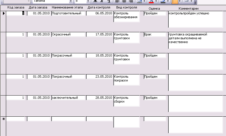 Так же реализован запрос о прохождении стадий контроля определенным заказом (рис.3.22). Интересующий заказ выбирается на форме «Отчеты» и после нажатия на кнопку «Прохождение заказом контроля» будет предоставлен отчет в виде формы (рис.3.23.).