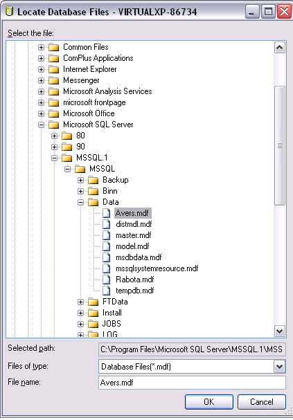 Для установки и использования этой БД, необходимо скопировать файлы "Avers.mdf" и " Avers_log.ldf" в директорию местонахождения БД в SQL Server. По умолчанию это C:\Program Files\Microsoft SQL Server\MSSQL.1\ MSSQL\Data. Затем необходимо запустить SQL Server, выбрать раздел "Database" и в контекстном меню выбрать пункт "Attach". В появившемся окне необходимо нажать кнопку "Add" и выбрать файл "Avers.mdf" и нажать "Ok" (рис 3.1.3).
