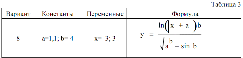 Для данных из таблицы 3 написать алгоритм и программу для вычисления формулы для х, введенных с клавиатуры. Произвести тестирование программы с помощью имеющегося математического пакета или калькулятора.