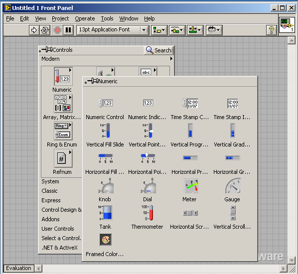 Палитра Controls вызывается щелчком правой кнопки мыши (ПКМ) в любом месте окна. Ее можно открыть также, выбрав Show Controls Palette в меню Window. Поиск нужного элемента осуществляется переходом в палитре на нижние уровни. Найденный элемент (точнее, его иконка) выделяется щелчком левой кнопки мыши (ЛКМ), переносится на FP и помещается на ней еще одним щелчком ЛКМ (можно и по другому: нажать ЛКМ – перенести – отпустить ЛКМ). После выбора элемента палитра исчезает, если ее не прикрепить, щелкнув ЛКМ по значку кнопки в левом верхнем углу палитры. Одновременно с выводом на лицевую панель элемента управления или индикации появляется соответствующий ему функциональный элемент в окне BD.