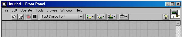 Оба окна имеют стандартную форму Windows. В верхней части каждого окна располагается полоса главного меню с названиями меню, как стандартными для Windows: File, Edit и Help, так и специфическими для LabVIEW: Operate, Tools, Browse, Window, содержание которых будет раскрываться по мере выполнения лабораторных работ. Ниже полосы главного меню размещена полоса инструментальной панели, служащая для запуска, отладки и редактирования ВП.