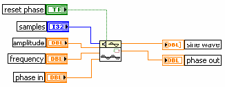 Reset phase (сбросить фазу) – логический вход, определяющий начальную фазу выходного процесса. По умолчанию на этом входе установлено состояние ИСТИНА. При этом начальная фаза синусоиды устанавливается равной значению на входе phase in (вход фазы). Если на входе Reset phase установить состояние ЛОЖЬ, то начальная фаза устанавливается равной значению фазы на выходе phase out (выход фазы) при последнем выполнении этого ВП.