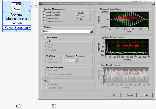ериод спектра равен частоте дискретизации f>д> = 1/ Δt. Как видим, для определения спектра на любой частоте достаточно знания спектра в диапазоне частот от 0 до половины частоты дискретизации. Поэтому максимальная частота спектра, отображаемого на экране виртуального прибора равна f>д>/2.LabVIEW располагает разнообразными ВП для спектрального анализа (более 20 типов). Воспользуемся экспресс-ВП Spectral Measurements (Рис. 5), в котором предусмотрена возможность усреднения (Averaging) и оконной обработки (Window) для уменьшения краевых эффектов.