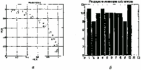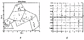 Весовые коэффициенты нейронов, определяющих центры кластеров, отмечены на рисунке 3.13, а цифрами. На рисунке 3.13, б показано распределение обучающих векторов по кластерам. Как и ожидалось, они распределены практически равномерно с разбросом от 8 до 12 векторов в кластере.