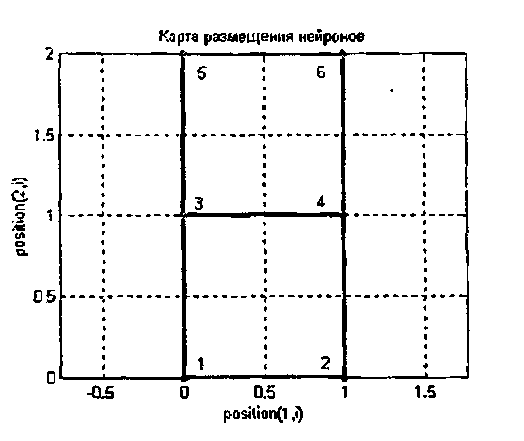 Это означает, что векторы входов 1 и 2 отнесены к кластеру с номером 2, векторы 3-6 - к кластеру 1, векторы 7-8 - к кластеру 4, векторы 9-10 - к кластеру 6, а векторы 11-12 - к кластеру 5. Номер кластера на рисунке соответствует номеру соответствующего нейрона на карте Кохонена.