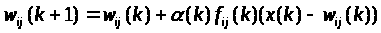 Параметр скорости обучения продолжает уменьшаться, но очень медленно, и именно поэтому этот этап именуется подстройкой. Малое значение окрестности и медленное уменьшение параметра скорости обучения хорошо настраивают сеть при сохранении размещения, найденного на предыдущем этапе. Число шагов на этапе подстройки должно значительно превышать число шагов на этапе размещения. На этом этапе происходит тонкая настройка весов нейронов по отношению к набору векторов входа.