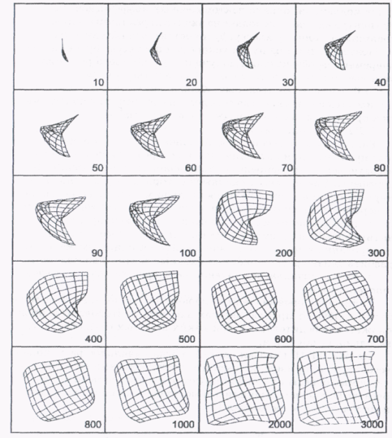 Результирующая карта после этапа размещения показана на рисунке 3.15, а. Продолжим обучение и зафиксируем карту после 1000 шагов этапа подстройки (рисунок 3.15, б), а затем после 4000 шагов (рисунок 3.15, в). Нетрудно убедиться, что нейроны карты весьма равномерно покрывают область векторов входа.