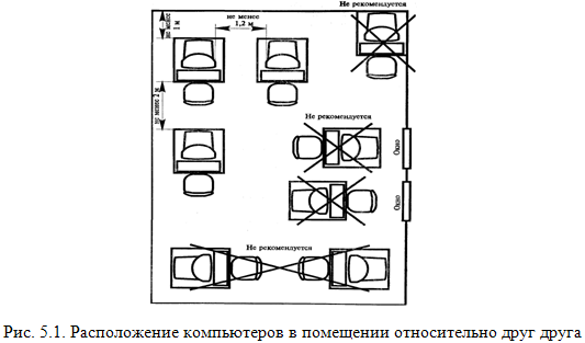 Планировка рабочих мест учебного класса должна быть продумана таким образом, чтобы обеспечить легкий доступ пользователей к своим рабочим местам и предотвратить возможность опрокидывания операторами мониторов и периферийного оборудования при эвакуации, а также исключить возможность несчастных случаев при эксплуатации.